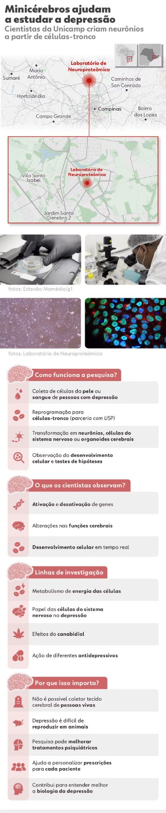 Um grupo de pesquisadores da Universidade Estadual de Campinas (Unicamp), em parceria com a geneticista Lygia da Veiga Pereira, da Universidade de São Paulo (USP), desenvolve uma técnica revolucionária para estudar a depressão. No Laboratório de Neuroproteômica, liderado pelo biólogo Daniel Martins-de-Souza, os pesquisadores criam minicérebros e neurônios a partir de células da pele e do sangue de pessoas com depressão.