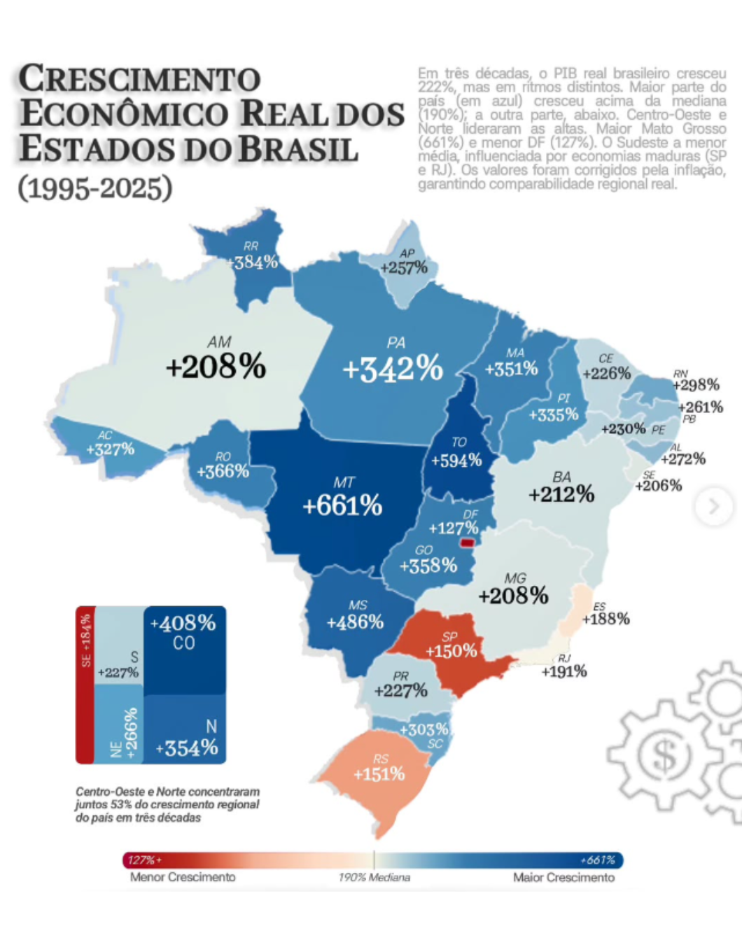 A região Centro-Oeste registrou crescimento médio de 408%, o maior do país. O desempenho reforça a mudança no eixo econômico brasileiro, que historicamente se concentrava no Sudeste e Sul.