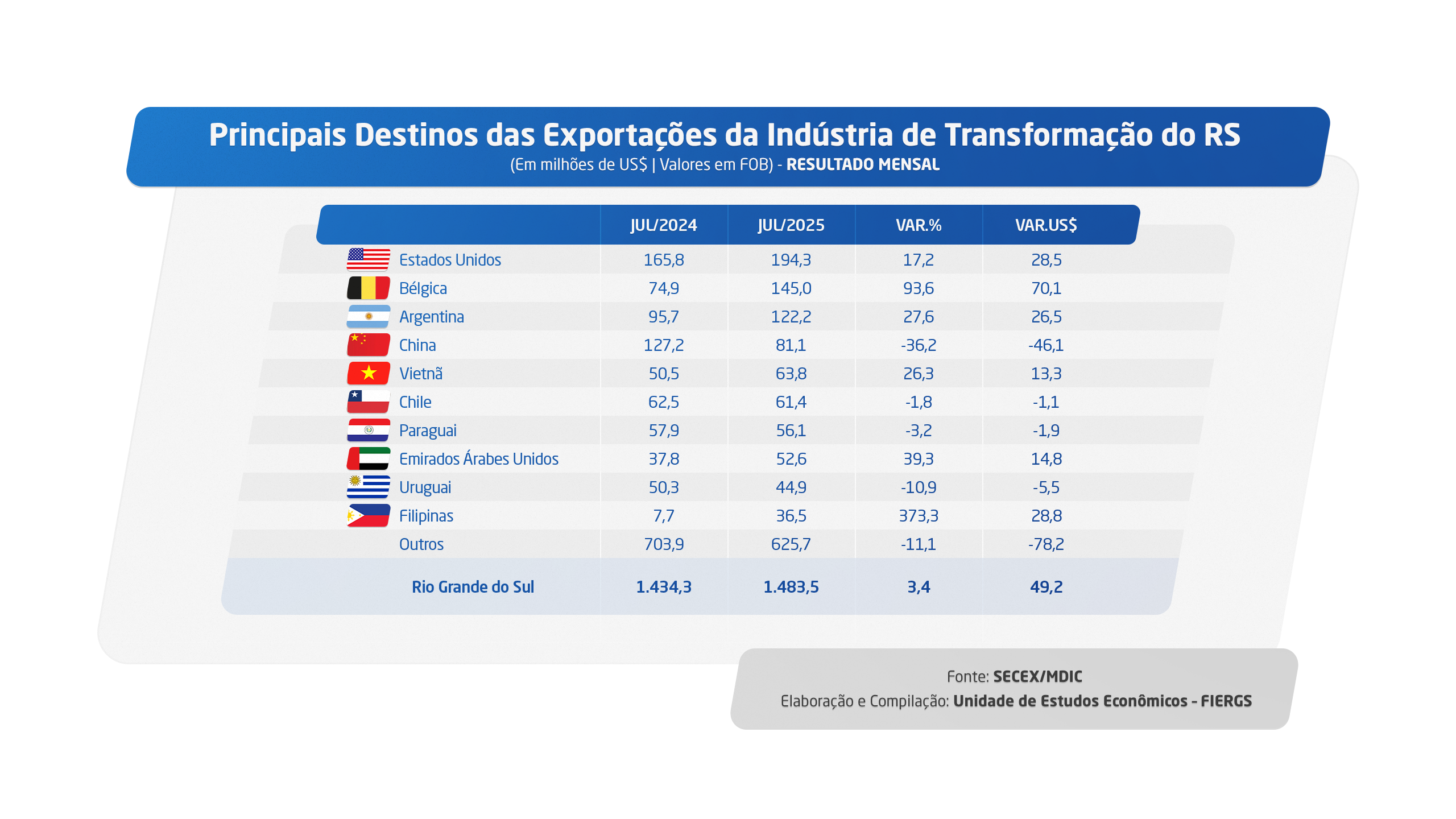 Mas no mês passado, último antes da entrada em vigor das novas taxas impostas pelo governo dos Estados Unidos, as exportações da indústria de transformação do Rio Grande do Sul para o país (US$ 194,3 milhões) apresentaram crescimento de 17,2% na receita, se comparado ao mesmo mês de 2024. Os EUA foram o principal destino das vendas externas gaúchas. O principal motor desse desempenho foi o segmento de Máquinas e materiais elétricos, que teve aumento expressivo de 255,9%. Celulose e papel (70,1%), Madeira (40,4%) e Alimentos (40,3%) também mostraram bom desempenho. Por outro lado, o crescimento geral foi atenuado por retrações pontuais. Os segmentos de Produtos de metal e Veículos automotores apresentaram quedas de 20,8% e 20,1%, respectivamente.