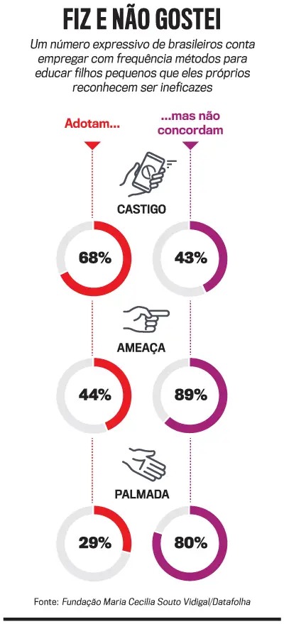Práticas como palmadas, beliscões e gritos são contraindicadas pela ciência. Estudo da Organização Mundial da Saúde (OMS) analisou dados de 49 países. Conclusão: a aplicação regular de sanções físicas reduz em 24% as chances de um desenvolvimento pleno e saudável. “As evidências são de que essa natureza de castigo não oferece nenhum benefício às crianças nem aos pais”, diz Etienne Krug, diretor da área de violência da OMS.